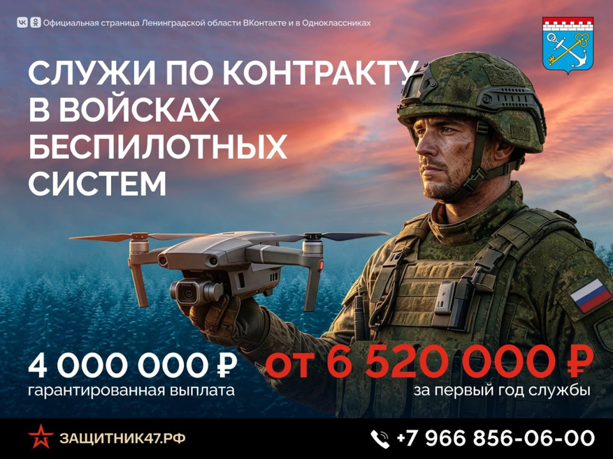 До 4 млн рублей увеличена единовременная выплата при заключении контракта в Ленобласти для поступления на военную службу в Войска беспилотных систем ВС РФ.